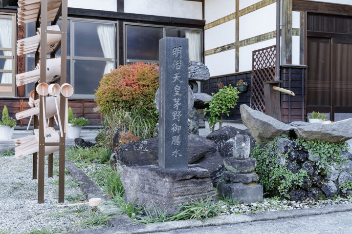 宗湖寺境内に「明治天皇茅野御膳水」碑があり、隣に御膳水となった法の真水(のりのましみず)が湧いています。