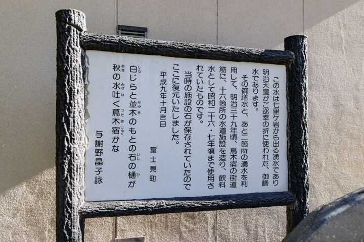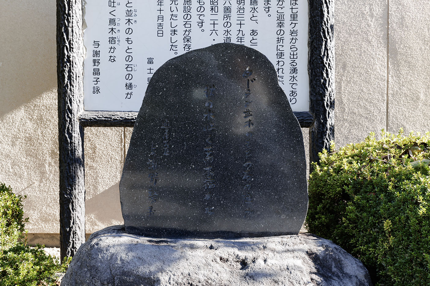 御膳水2025.11.21 陵墓探訪記 御膳水の湧水跡 ごぜんすいのゆうすいあと 上記地図が正常に表示されない場合 長野県諏訪郡富士見町落合上蔦木2426 富士見町消防団第九分団屯所南 中央自動車道 小淵沢ICから車で9分 2025.10.28訪問 1880年(明治13年)6月23日、有賀源六宅にてご休憩。 御膳水 与謝野晶子歌碑