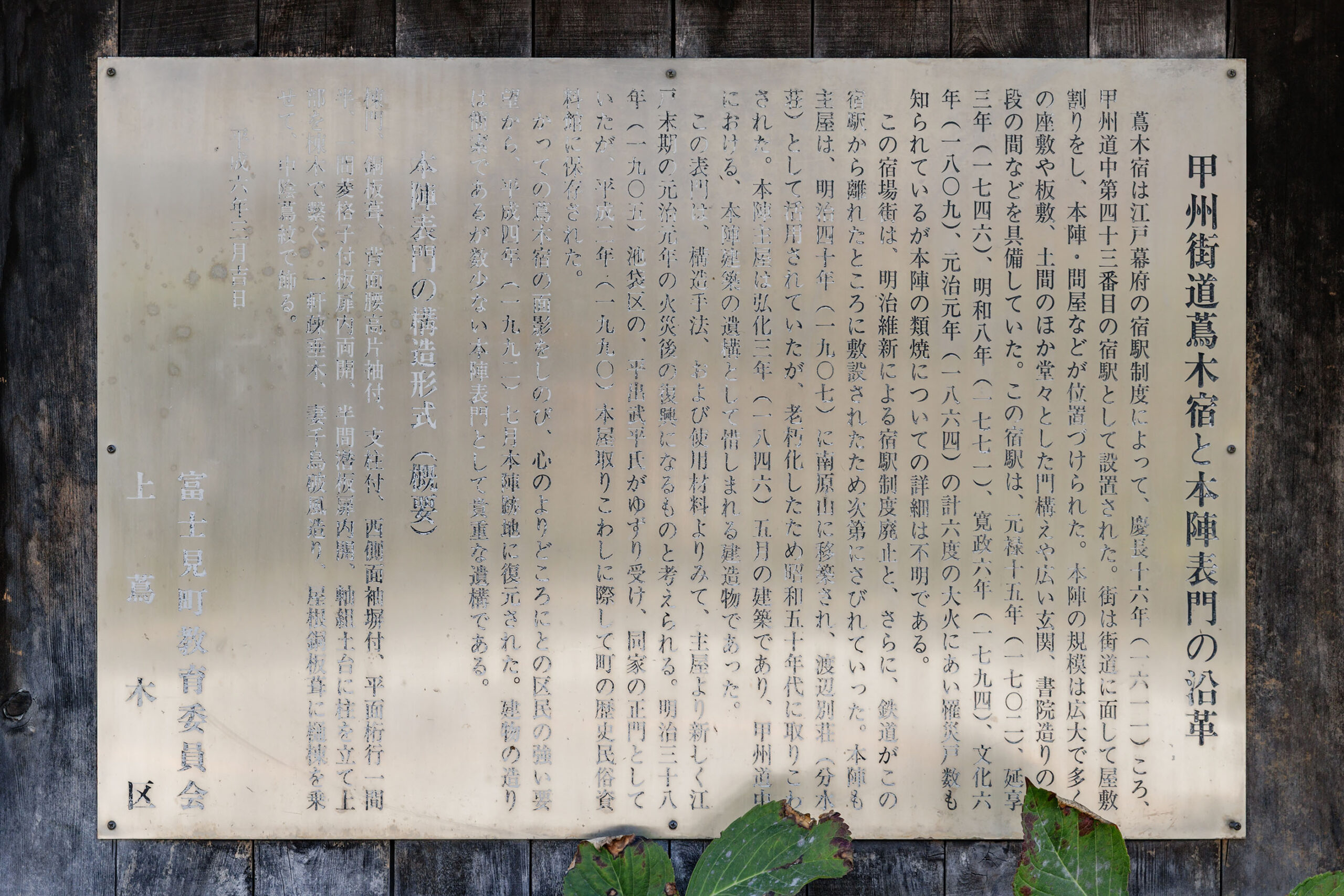 御小休所2025.11.22 陵墓探訪記 明治大帝御駐輦跡 めいじたいていごちゅうれんあと 上記地図が正常に表示されない場合 長野県諏訪郡富士見町落合上蔦木2439-1 上蔦木集落センター 中央自動車道 小淵沢ICから車で9分 2025.10.28訪問 1880年(明治13年)6月23日、有賀源六宅にてご休憩。 旧蔦木宿本陣表門