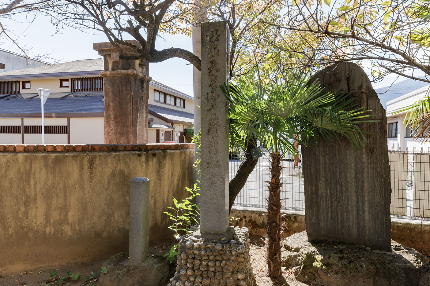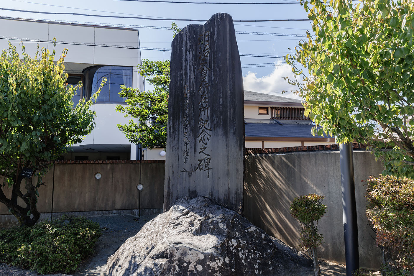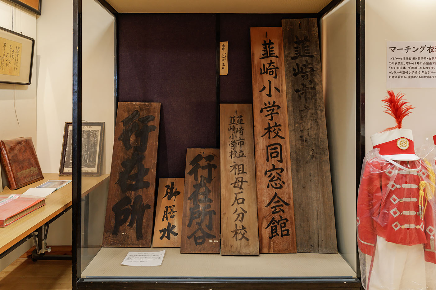 韮崎小学校西門そばに石碑がありますが、校内に入らないと正面が見えないため、学校に電話をして門を開けていただきました。対応していただいた教員の方のご厚意で、校内の資料室にある行在所の標札など貴重な所蔵品を見学することもできました。