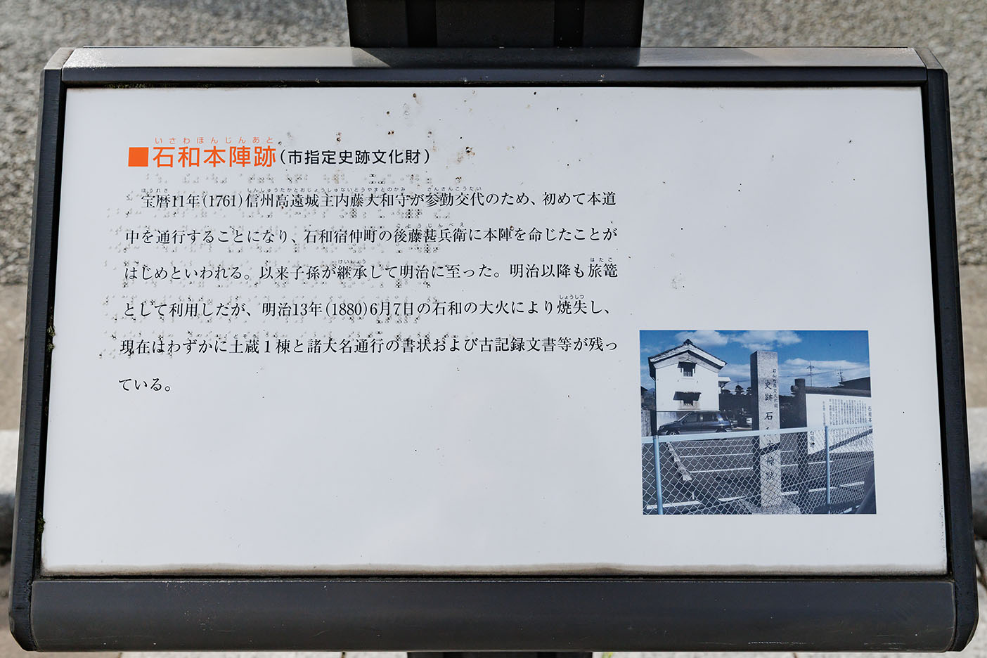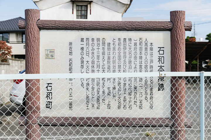 石和本陣が御小休所として定められていましたが、巡幸直前に大火で焼失して休憩はできなかったそうです。現在は焼け残った土蔵一棟のみとなっています。