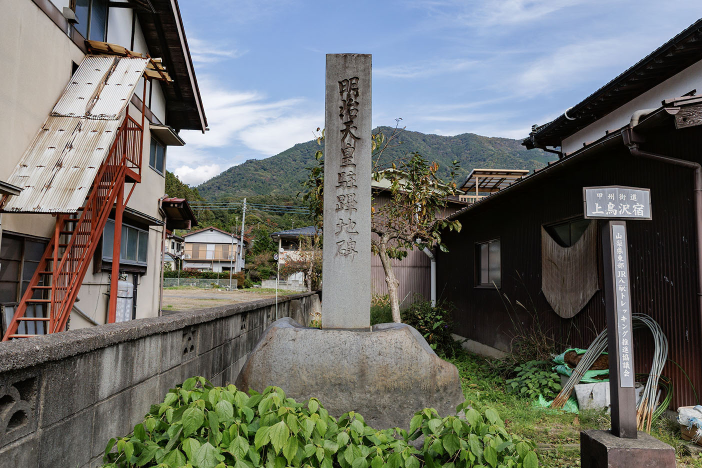 御小休所2025.12.07 陵墓探訪記 明治天皇駐蹕地碑 めいじてんのうちゅうひつちひ 上記地図が正常に表示されない場合 山梨県大月市富浜町鳥沢1867 JR 鳥沢駅下車 徒歩4分 2025.10.29訪問 1880年(明治13年)6月18日、井上清武宅にてご休憩。