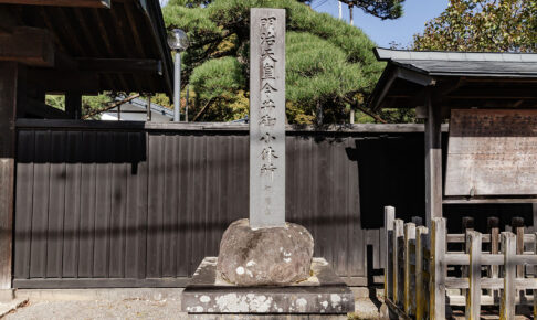めいじてんのうふじかわごこやすみどころ 愛知県岡崎市藤川町中町北6-1 藤川宿資料館 名鉄 藤川駅下車 徒歩6分 2023.7.23訪問 石碑はありませんが、藤川宿資料館に当時の門が残されています。 1868年(明治元年…